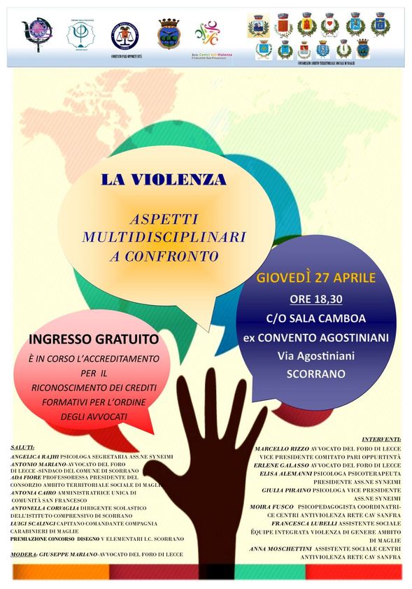 Il 27 aprile si terrà l’evento La violenza: aspetti multidisciplinari a confronto, dalle 18:30 presso la Sala Camboa di Scorrano (LE).
