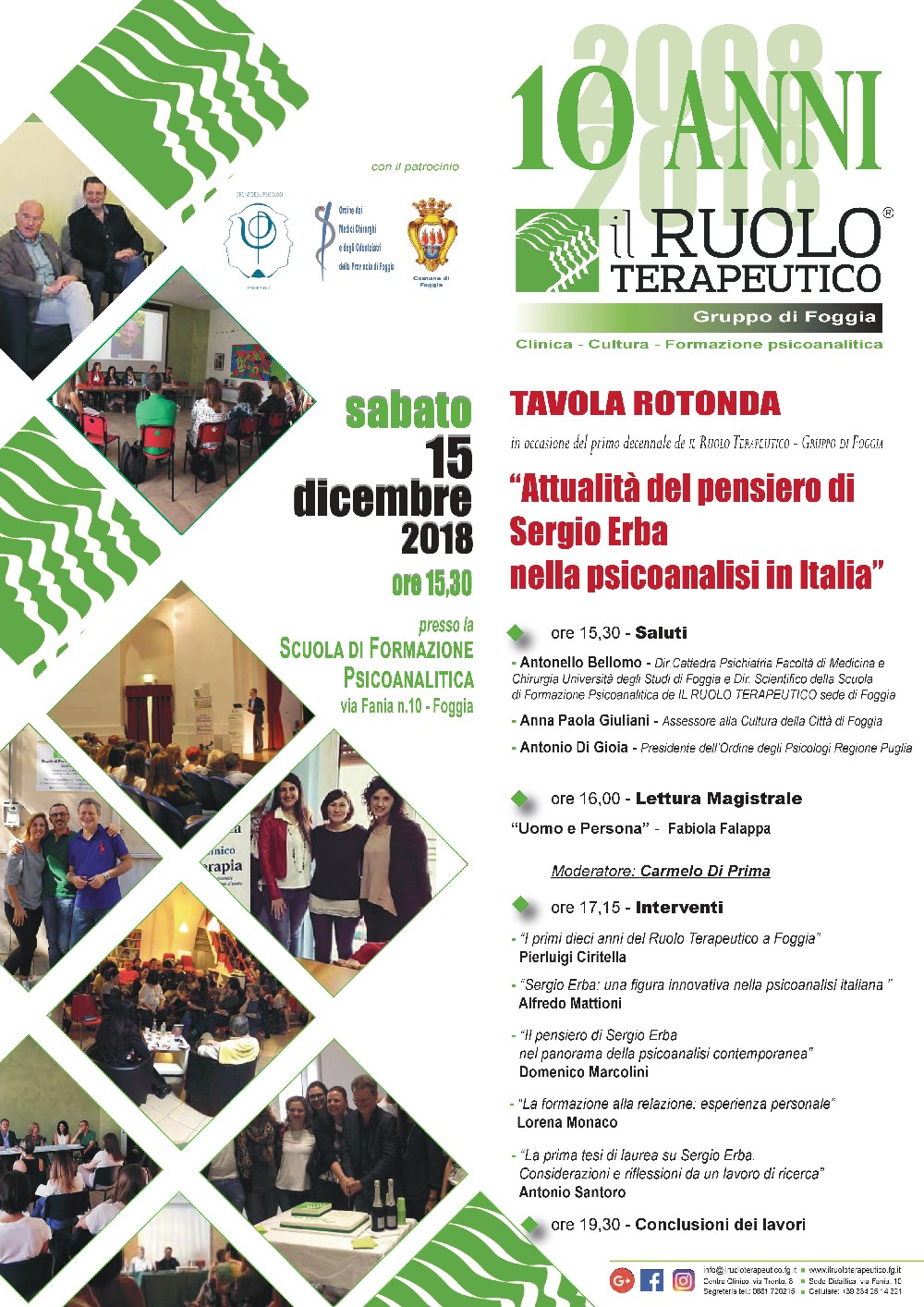 Presso la sede della Scuola di Psicoterapia “il Ruolo Terapeutico – Gruppo di Foggia”, in occasione del suo primo decennale, si svolgerà il 15 dicembre, a partire dalle 15:30, la tavola rotonda dal titolo “Attualità del pensiero di Sergio Erba nella psicoanalisi in Italia”.