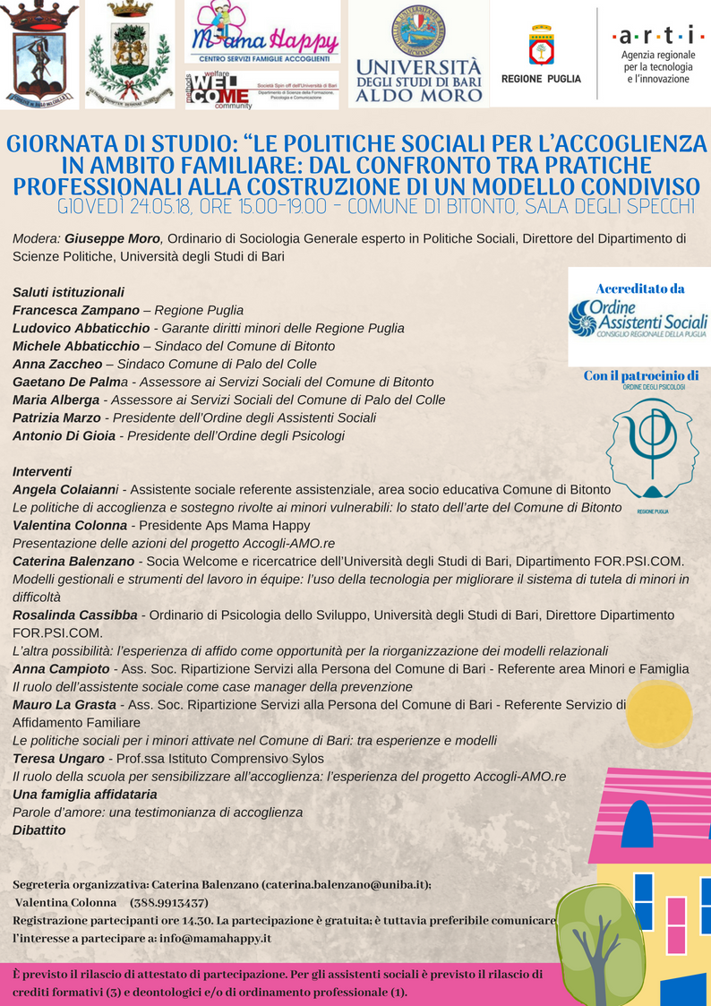 La giornata studio è promossa dalla spin-off d’innovazione sociale Wel.Co.Me. s.r.l. dell’Università di Bari e dall’associazione di promozione sociale Mama Happy – Centro Famiglie Servizi Accoglienti – nell’ambito del progetto Accogli-AMO.re, realizzato nell’ATS Bitonto-Palo del Colle allo scopo di promuovere e potenziare i percorsi di affido familiare.