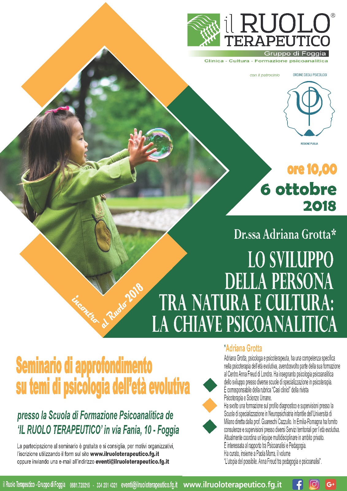 Il seminario di approfondimento su temi di psicologia dell’età evolutiva “Lo sviluppo della persona tra natura e cultura: la chiave psicoanalitica” organizzato da Il Ruolo Terapeutico – gruppo di Foggia e patrocinato dall’Ordine degli Psicologi di Puglia, si svolgerà a Foggia in via Fania 10, il 6 ottobre p.v.