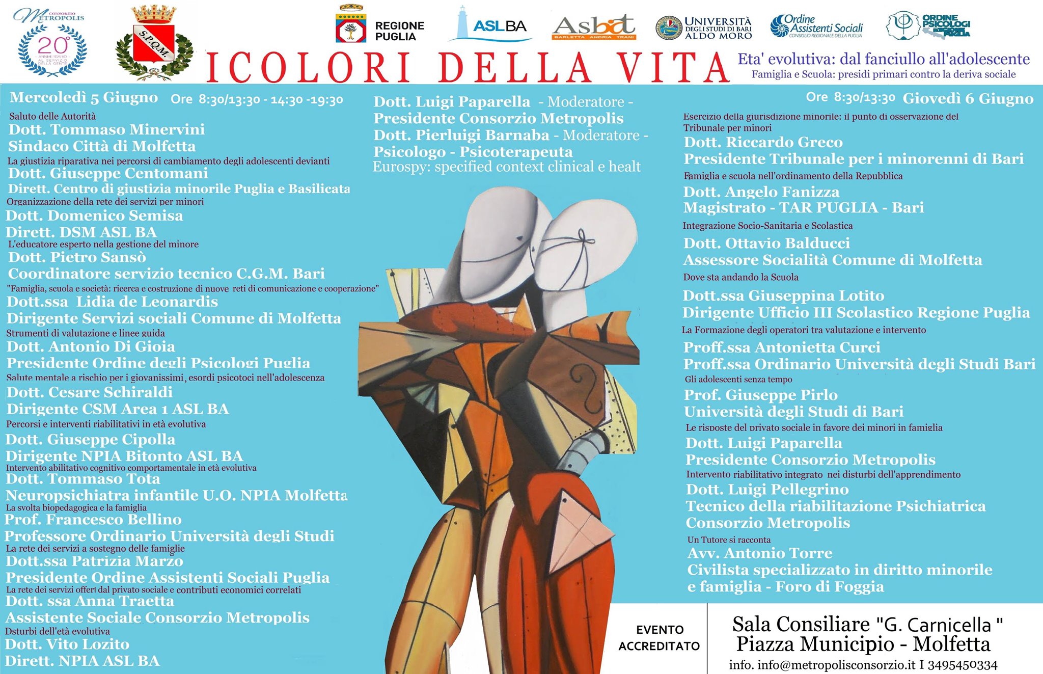 Mercoledì 5 e Giovedì 6 Giugno si terrà l’evento “I Colori della Vita” presso la Sala Consiliare “G. Carnicella” in Piazza Municipio a Molfetta