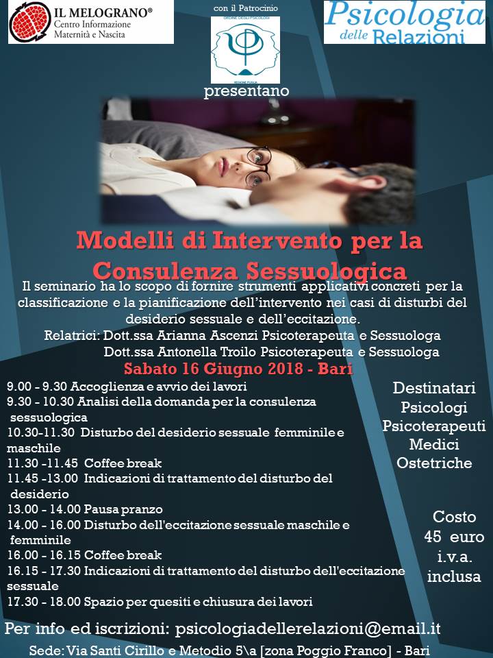 Sabato 16 giugno si terrà a Bari il convegno intitolato “Modelli di Intervento per la Consulenza Sessuologica”, patrocinato dall’associazione “Il Melograno” e dall’Ordine degli Psicologi della Regione Puglia.