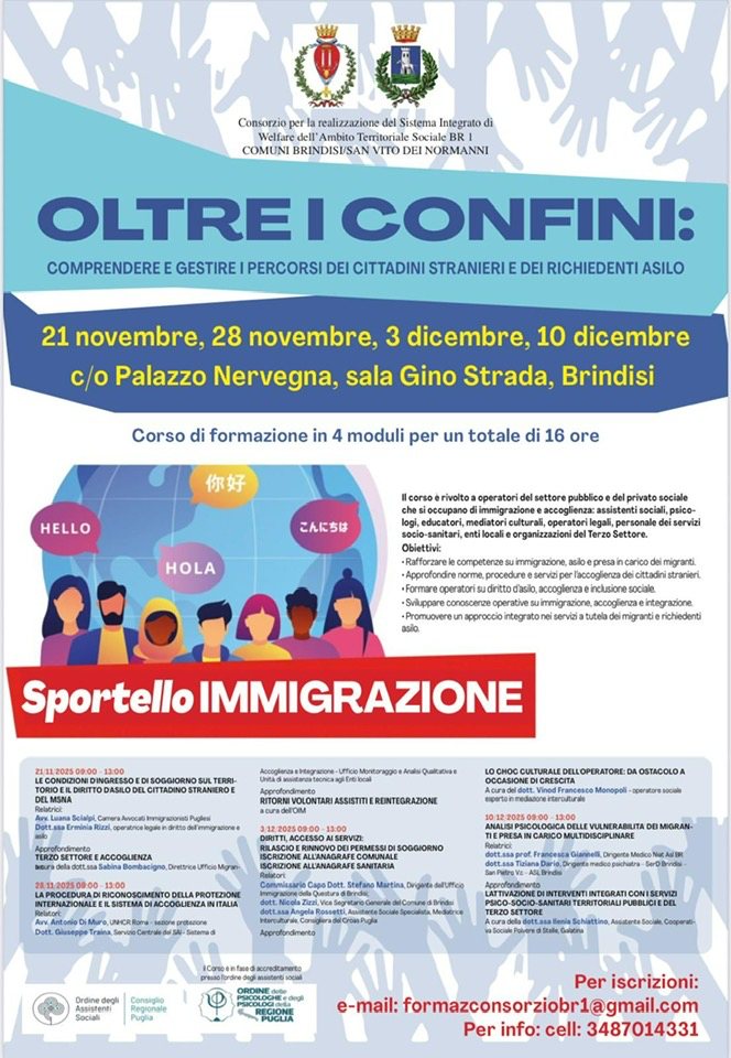 Il Consorzio ATS BR1 (Brindisi – San Vito dei Normanni) organizza il corso di formazione gratuita per operatori del sociale:  “OLTRE I CONFINI: comprendere e gestire i percorsi dei cittadini stranieri e dei richiedenti asilo” 4 moduli – 16 ore totali  21 e 28 novembre, 3 e 10 dicembre 2025.