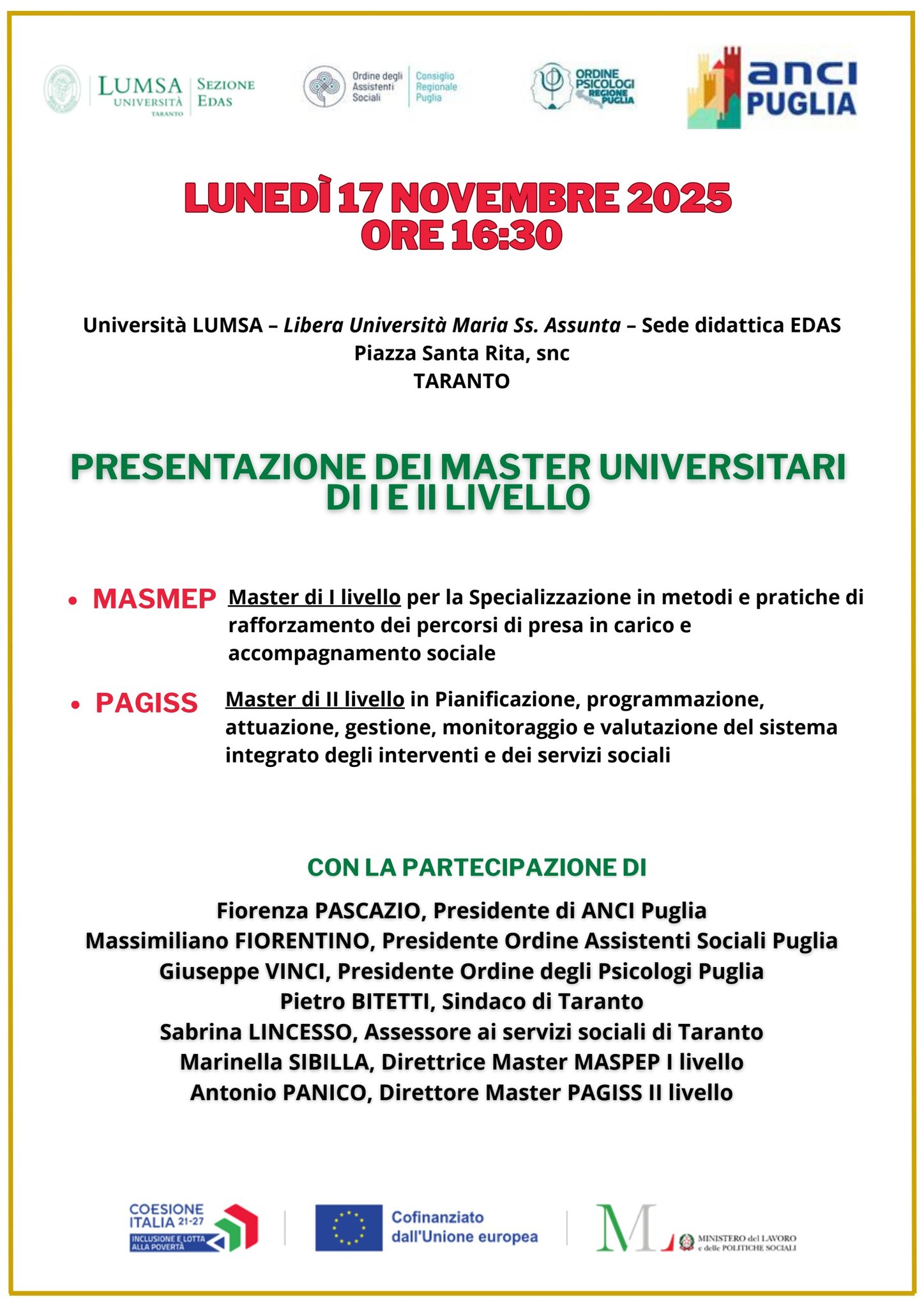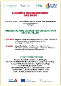 Oggi lunedì 17 novembre 2025 si terrà presso l’Università LUMSA di Taranto, la Presentazione dei Master Universitari di I e II livello interamente finanziati dal Ministero del Lavoro e delle Politiche Sociali, totalmente gratuiti. MASMEP: Master di I livello per la Specializzazione in metodi e pratiche di rafforzamento dei percorsi di presa in carico e accompagnamento sociale.