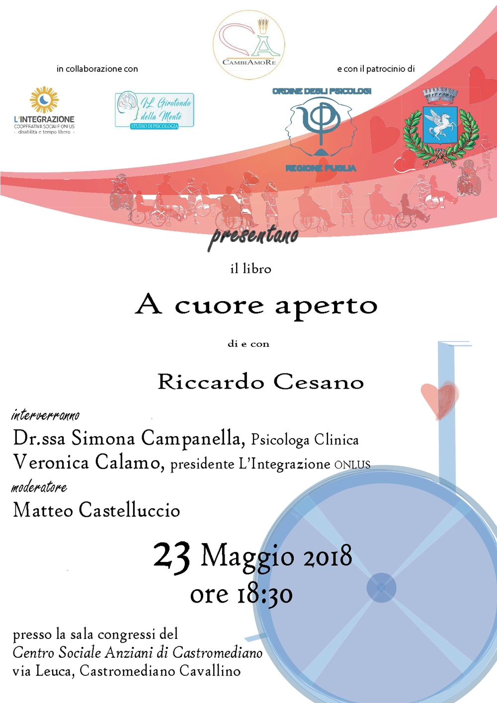 Mercoledì 23 maggio, a partire dalle ore 18:30, presso il Centro Sociale Anziani di Castromediano Cavallino, si terrà la presentazione del libro “A cuore aperto” di e con Riccardo Cesano, evento patrocinato dall’Ordine.