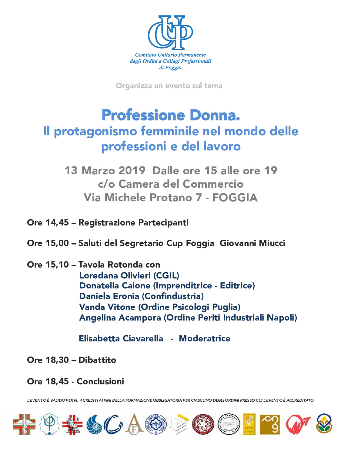 Il 13 marzo, dalle 15 alle 19, si svolgerà l’evento organizzato dal CUP – Comitato Unitario Permanente degli Ordini e COllegi Professionali di Foggia dal titolo “Professione Donna. Il protagonismo femminile nel mondo delle professioni e del lavoro” con tavola rotonda di imprenditrici e professioniste seguito da dibattito.