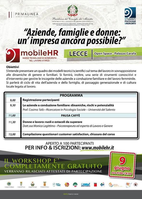Il prossimo 9 giugno, dalle 9 alle 14, a Lecce, si terrà l’evento “Aziende, famiglie e donne: un’impresa ancora possibile?” afferente al Progetto MobileHR, patrocinato dall’Ordine degli Psicologi di Puglia.