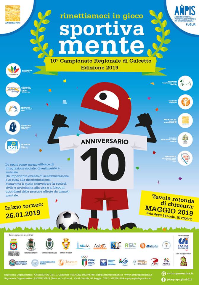 Sabato 26 gennaio presso la struttura sportiva Gio’ Sport a Palombaio alle ore 10:30 avrà inizio la prima giornata del 10° Campionato regionale di Calcetto “Rimettiamoci in gioco Sportivamente”, organizzato da Anpis Puglia.