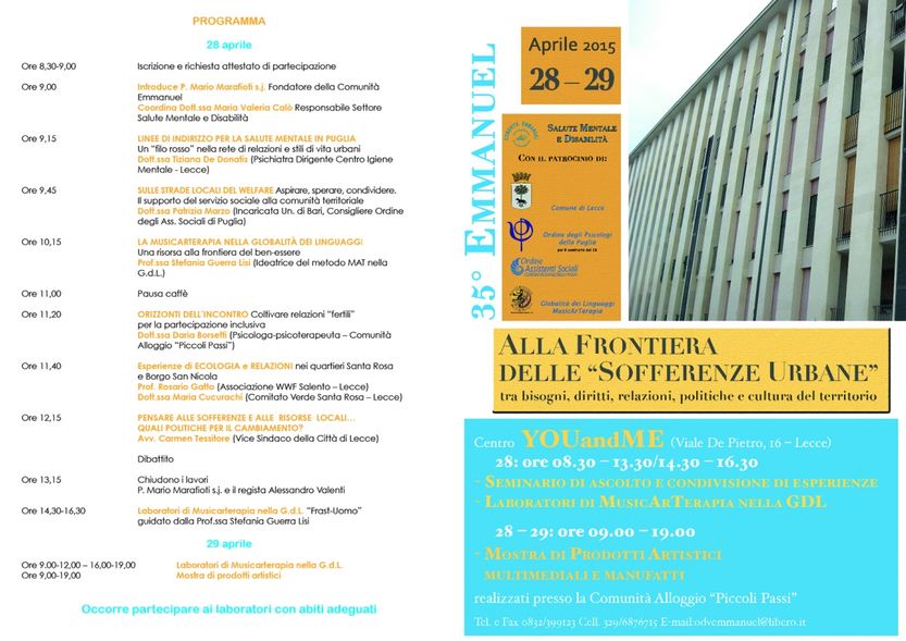 Seminario sul tema “ALLA FRONTIERA DELLE SOFFERENZE URBANE tra Bisogni, Diritti, Relazioni, Politiche e Cultura del Territorio” che si terrà a LECCE presso il Centro “You and Me”, V.le De Pietro n. 16 nell’ambito dell’iniziativa di commemorazione del 35° anno della Comunità Emmanuel, organizzata dal Settore Salute Mentale e Disabilità nei giorni 28 e 29 Aprile.