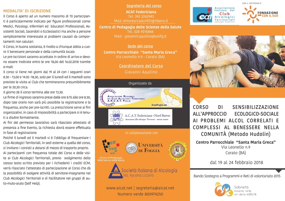 Il corso “Sensibilizzazione all’approccio ecologico-sociale ai problemi alcol correlati e complessi al benessere nella comunità”, patrocinato dall’Ordine degli Psicologi di Puglia, si terrà dal 19 al 24 febbraio presso i locali del Centro Parrocchiale Santa Maria Greca a Corato (BAT).