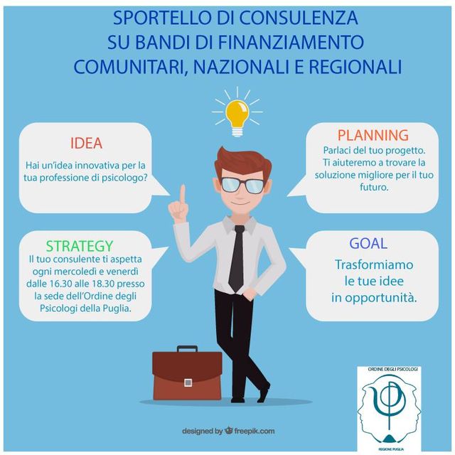 A beneficio, dunque, degli iscritti interessati, l’Ordine degli Psicologi della Regione Puglia ha attivato un indirizzo di posta dedicato (sportello@psicologipuglia.it), ed un numero telefonico 392/7861641 (attivo per informazioni nei giorni: mercoledi e venerdi dalle 16.30 alle 17.30), mediante il quale ognuno potrà richiedere un incontro dedicato per conoscere le modalità ed i termini del finanziamento pubblico erogabile a sostegno della propria iniziativa professionale, anche in termini di autoimpiego.