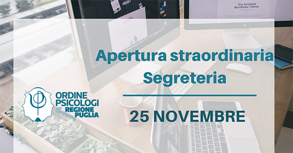 Considerata la complessità dello svolgimento delle operazioni elettorali in corso, considerato anche l’invito pervenuto da parte della Presidente del Seggio elettorale, si comunica l’apertura straordinaria della Segreteria dell’Ordine per la giornata di oggi 25 novembre 2019 con il seguente orario: dalle ore 9.30 alle ore 19.30.