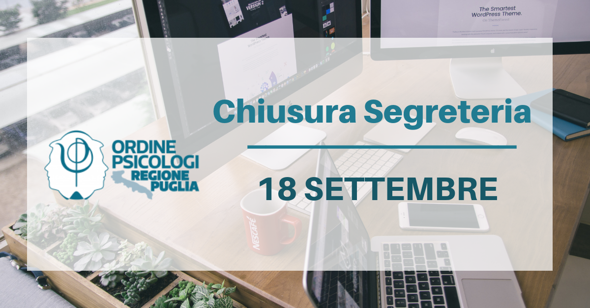 La segreteria dell’Ordine degli Psicologi Puglia rimarrà chiusa per la data del 18 Settembre in occasione del Convegno organizzato dall’Ordine degli Psicologi della Regione Puglia “Psicologia in digitale. Dal passaparola all’epoca del social network”.