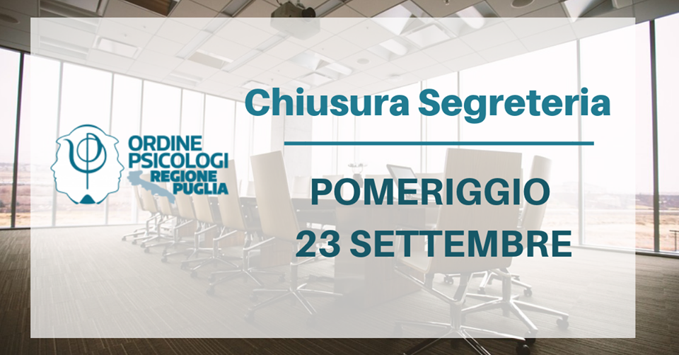 Si comunica che la Segreteria dell’Ordine degli Psicologi della Regione Puglia sarà chiusa al pubblico il pomeriggio del giorno 23 Settembre in occasione dell’evento organizzato a Trani “Ordine incontra BAT”.