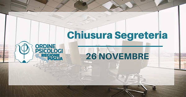Si comunica che la Segreteria dell’Ordine degli Psicologi della Regione Puglia sarà chiusa al pubblico per il giorno 26 NOVEMBRE.