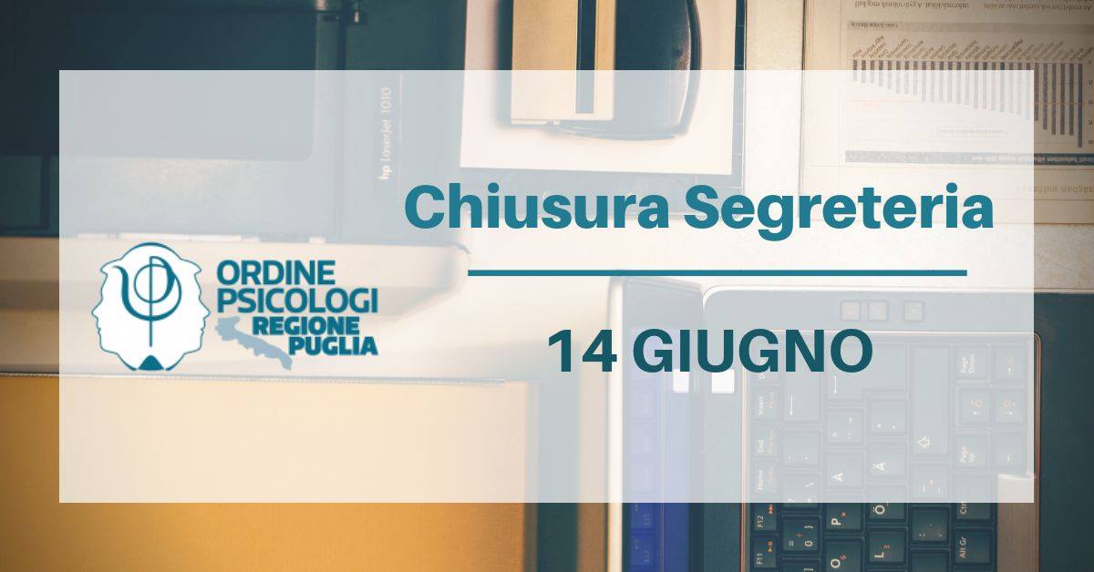 Si comunica che, in occasione del Convegno organizzato dall’Ordine degli Psicologi della Regione Puglia “Prevenzione e Intervento sul Burnout nelle Professioni di Aiuto: dal monitoraggio ai diversi approcci integrativi”, la Segreteria resterà chiusa il giorno 14 giugno.