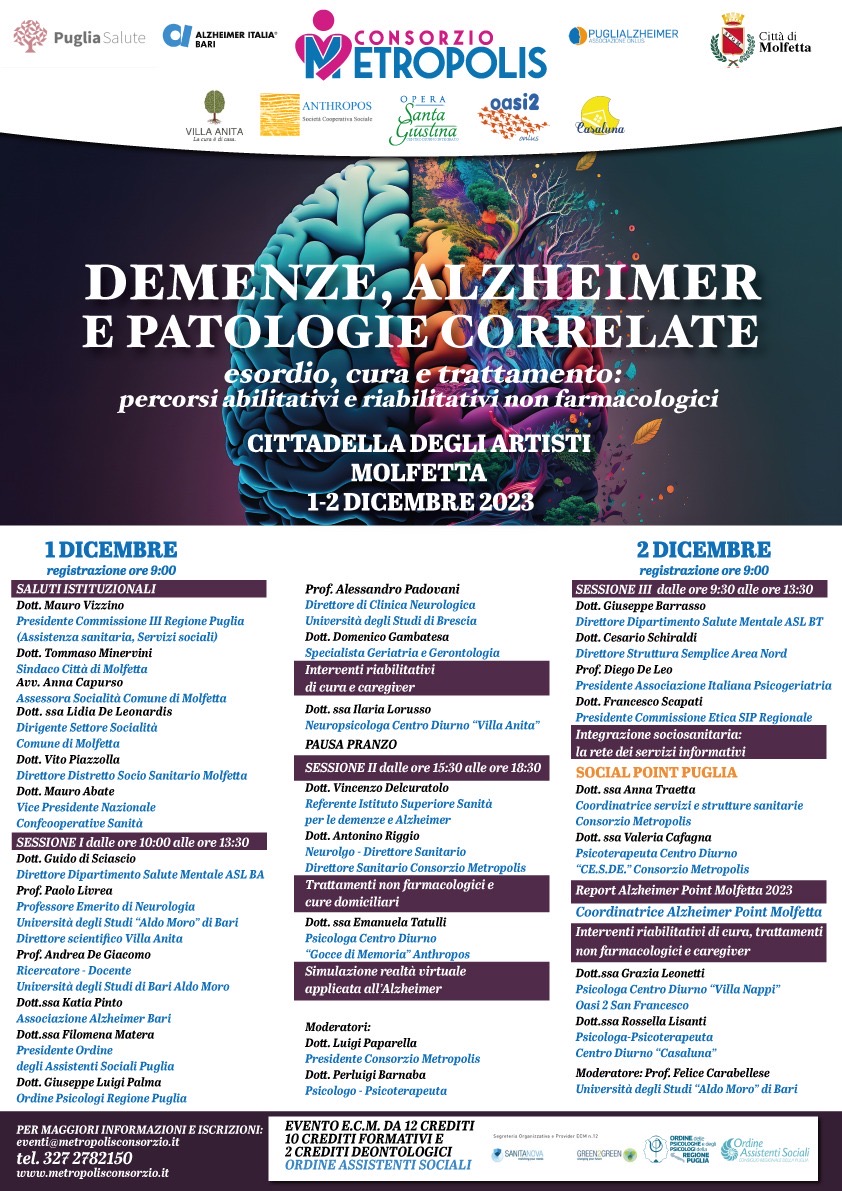 L’Ordine delle Psicologhe e degli Psicologi della Regione Puglia ha stipulato una Convenzione con l’evento E.C.M. Demenze, Alzheimer e Patologie Correlate che si terrà nei giorni 1 e 2 dicembre presso La Cittadella degli Artisti, via Bisceglie 775, Molfetta (BA).