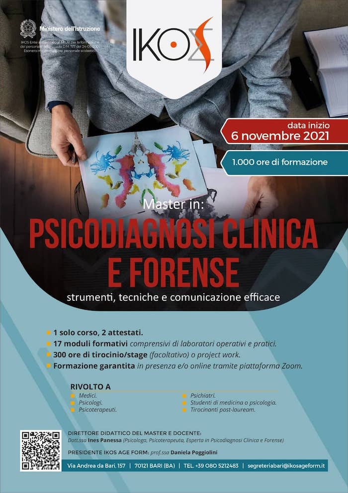 L’Ordine degli Psicologi Regione Puglia ha stipulato una Convenzione con il Master in Psicodiagnosi clinica e forense: strumenti, tecniche e comunicazione efficace, 1 edizione – a.a. 2021/2022 di IKOS AgeForm di Bari.