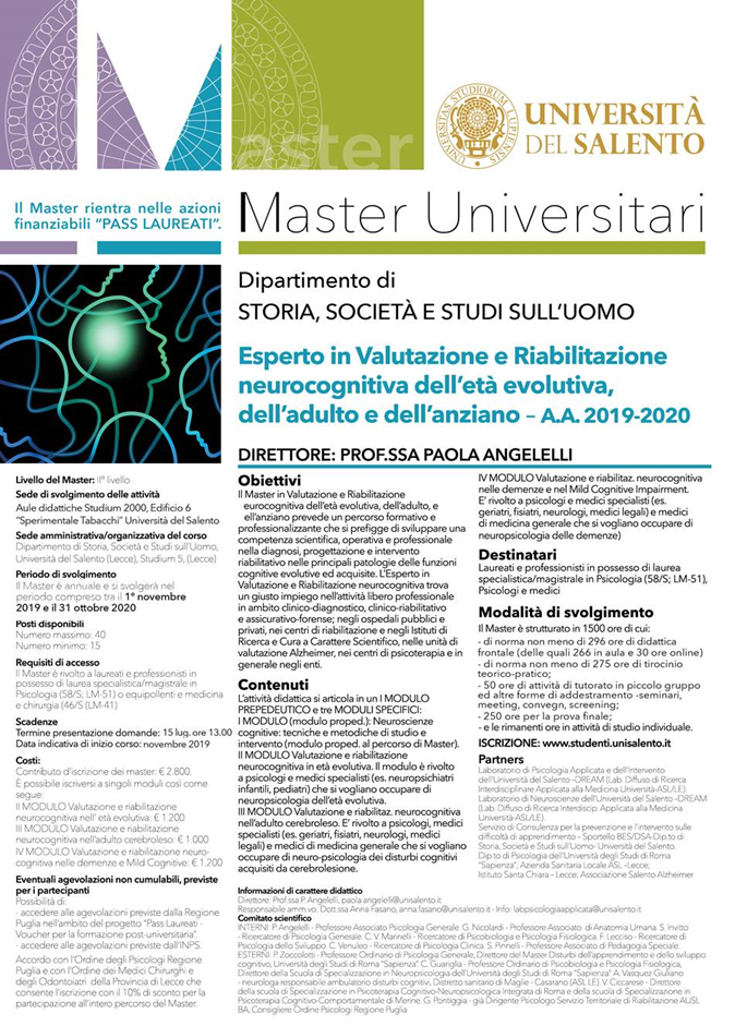 E’ stato il pubblicato il bando della II edizione del Master di II livello in Valutazione e Riabilitazione Neurocognitiva dell’età evolutiva, dell’adulto e dell’anziano a.a. 2019-2020 dell’Università del Salento. Sarà possibile iscriversi dal 15 giugno 2019.