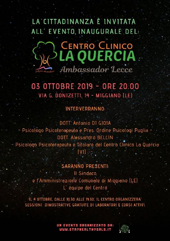 Siamo lieti di invitarvi all’evento inaugurale del Centro Clinico “La Quercia” Ambassador Lecce che si terrà domani 03 ottobre 2019 alle ore 20.00.