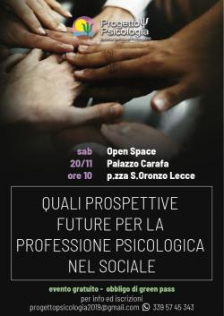 Vi invitiamo all’evento patrocinato dall’Ordine degli Psicologi Puglia “Quali prospettive future per la professione psicologica nel sociale”, che si terrà il giorno 20 novembre p.v. alle ore 10:00, presso Palazzo Carafa, piazza S. Oronzo a Lecce.