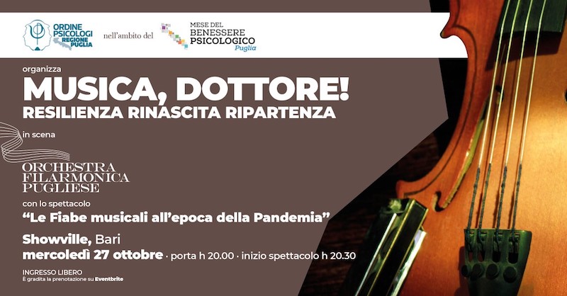 Lo spettacolo “Le Fiabe musicali all’epoca della pandemia” è organizzato dall’Ordine degli Psicologi della Puglia per il prossimo 27 ottobre e vuole esorcizzare le paure e le fragilità di ognuno attraverso due strumenti di comunicazione potentissimi, la musica e la fiaba.