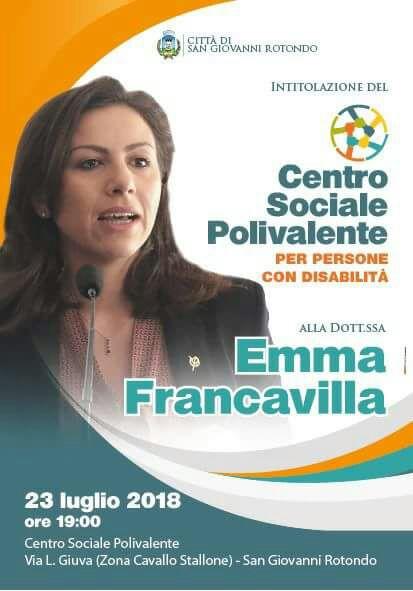 SAN GIOVANNI ROTONDO 19 luglio 2018 – Il 23 luglio, l’Amministrazione comunale dedicherà alla memoria della dr.ssa Emma Francavilla il Centro Sociale Polivalente per persone con disabilità, ubicato in via L. Giuva, in zona Cavallo Stallone.