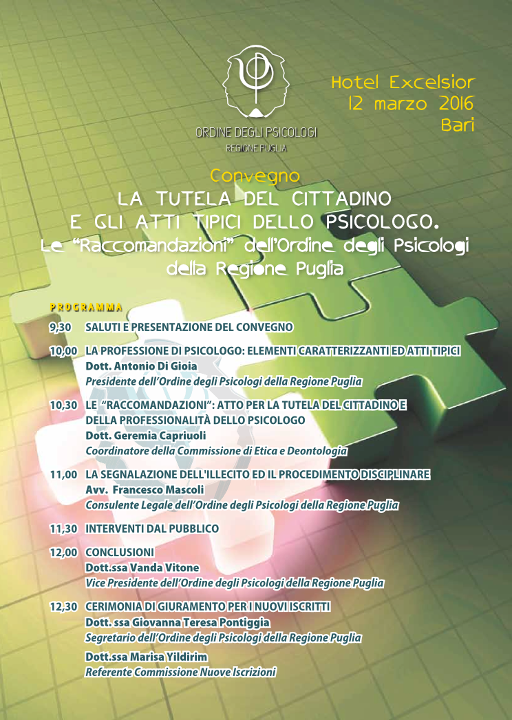 la presente per comunicarTi che l’Ordine degli Psicologi della Regione Puglia organizzerà per il giorno 12 marzo 2016, un convegno dal titolo“La tutela del cittadino e gli atti tipici dello psicologo. Le Raccomandazioni dell’Ordine degli Psicologi della Regione Puglia”.