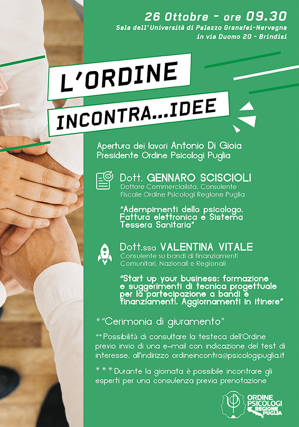 Seguendo la pagina Facebook dell’Ordine degli Psicologi della Regione Puglia, potrai conoscere per tempo le prossime date e le prossime tappe del progetto l’Ordine Incontra…Idee, per le settimane successive.