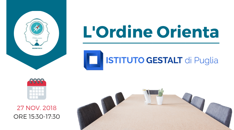 Il prossimo evento sarà gestito dall’Istituto Gestalt si terrà il 27 novembre 2018 dalle ore 15.30 alle ore 17.30 presso la sede dell’Ordine degli Psicologi della Regione Puglia in via F.lli Sorrentino 6, a Bari.