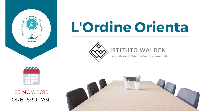 Il prossimo evento sarà gestito dall’Istituto Walden e si terrà il 23 novembre 2018 dalle ore 15.30 alle ore 17.30 presso la sede dell’Ordine degli Psicologi della Regione Puglia in via F.lli Sorrentino 6, a Bari.