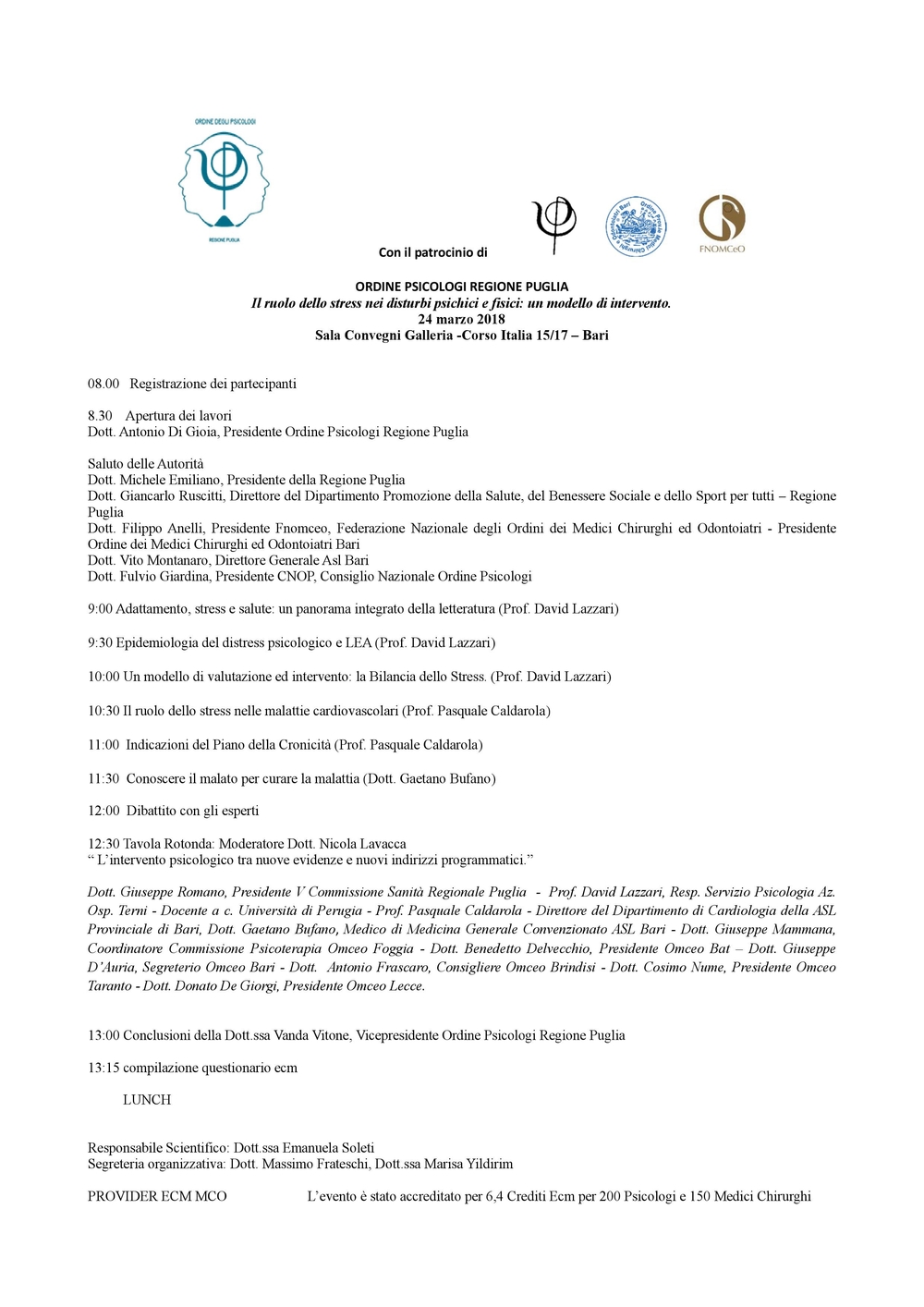 È disponibile il programma del Convegno organizzato dall’Ordine degli Psicologi della Regione Puglia, sul tema “Il ruolo dello stress nei disturbi psichici e fisici: un modello di intervento”, previsto per il giorno 24 Marzo 2018, dalle ore 8.00 alle ore 13.30, presso la Sala Convegni Galleria in Corso Italia 15/17 a Bari.