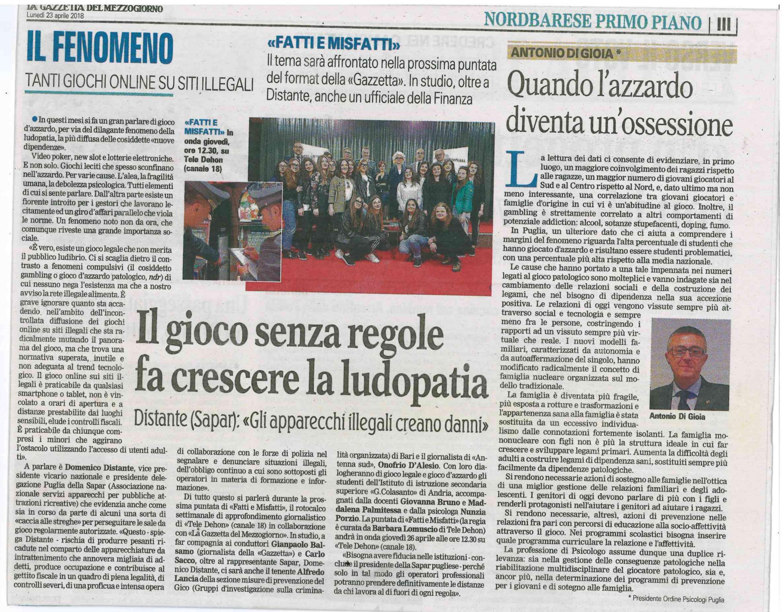 Condividiamo l’ultimo articolo scritto dal Presidente Antonio di Gioia sul tema della ludopatia e del gioco d’azzardo patologico, di cui riportiamo un estratto: