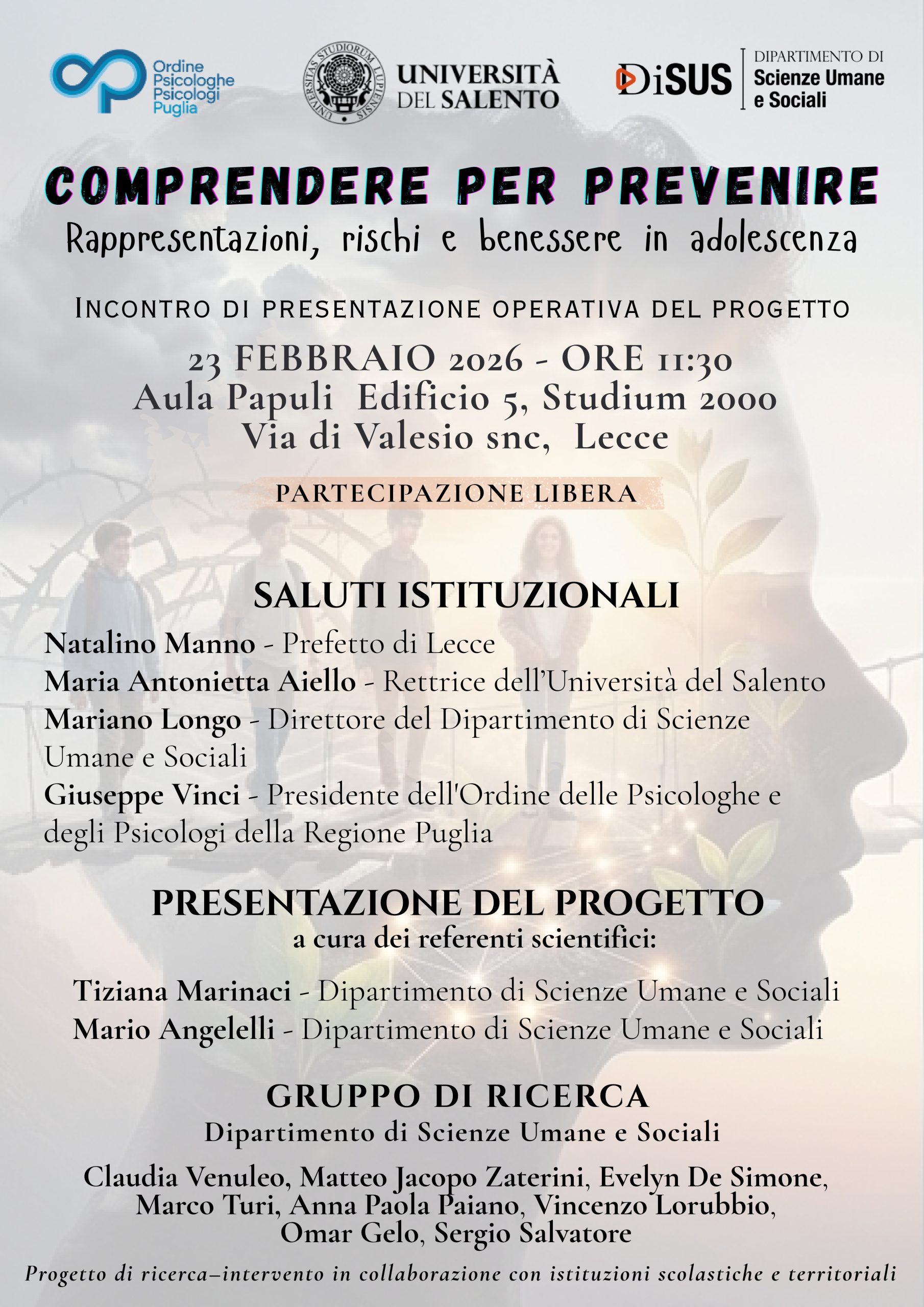 L’incontro di presentazione operativa si terrà il 23 febbraio alle ore 11.30 presso l’Aula Papuli (Studium 2000) dell’Università del Salento, alla presenza dei partner istituzionali e dei dirigenti scolastici coinvolti.