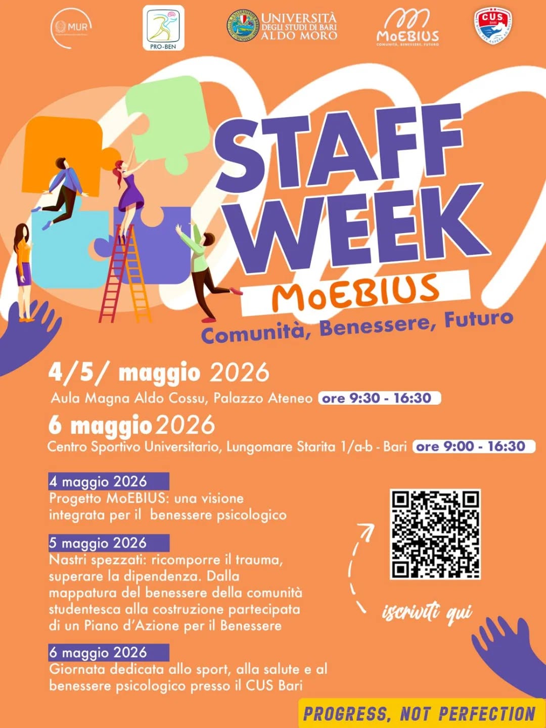 L’Università degli Studi di Bari Aldo Moro ospiterà dal 4 al 6 maggio 2026 la Staff Week “MoEBIUS: Comunità, Benessere, Futuro”, evento promosso dal Servizio di Counseling Psicologico nell’ambito del Progetto MoEBIUS, con il patrocinio dell’Ordine delle Psicologhe e degli Psicologi Puglia. L’iniziativa si svolgerà presso l’Aula Magna Aldo Cossue il CUS Bari, alternando momenti di confronto scientifico, attività partecipative e iniziative sportive.