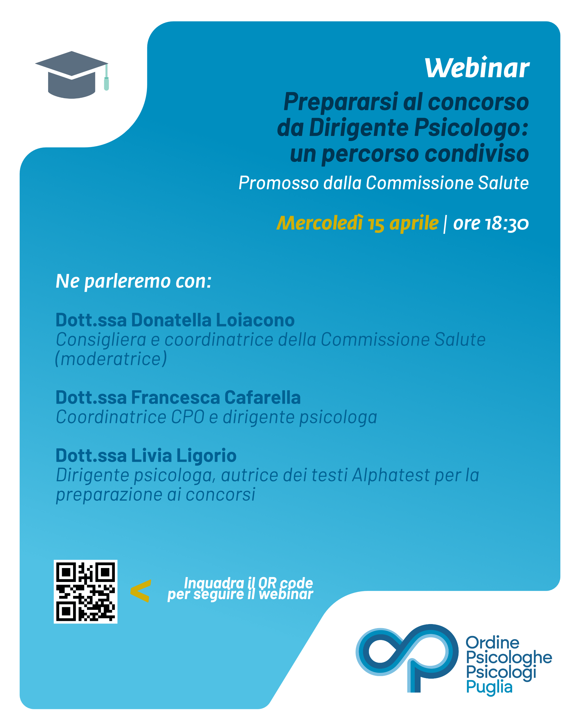 La Commissione Salute coordinata dalla consigliera Donatella Loiacono, organizza un webinar dedicato a tutte le colleghe e a tutti i colleghi che stanno per affrontare il concorso per Dirigente Psicologo.