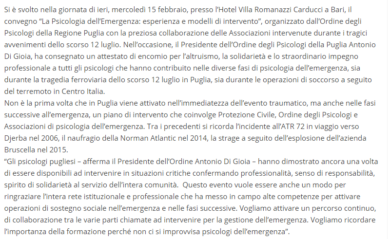 Oltre Free press, quotidiano di notizie di attualità, politica, cultura, turismo, sport e spettacoli dedica un articolo all’evento dello scorso 15 febbraio 2017, La Psicologia dell’Emergenza.