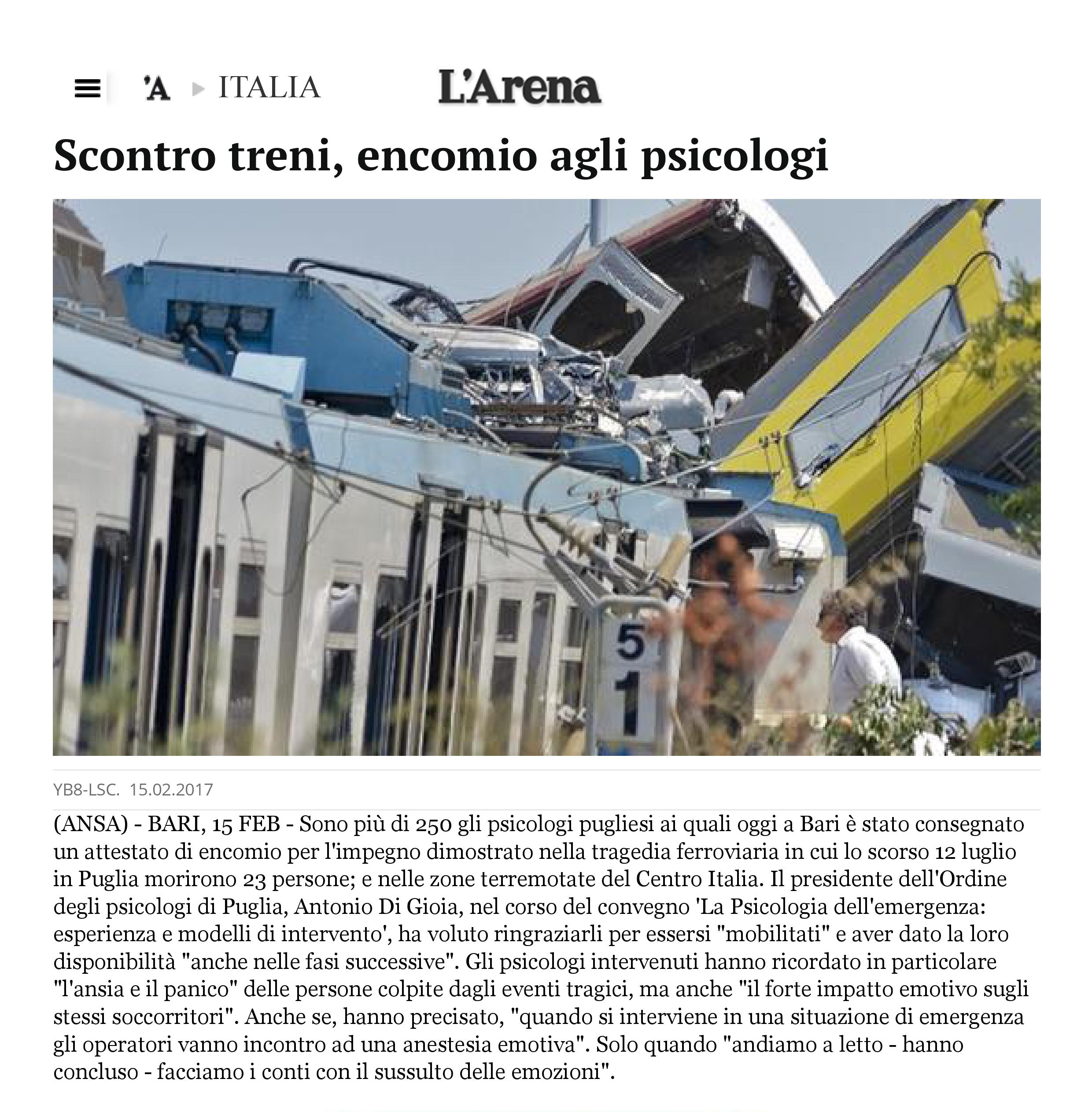 Scontro tra treni, encomio agli psicologi è il titolo dell’articolo che L’Arena ha dedicato all’evento dello scorso 15 febbraio 2017 organizzato dall’Ordine degli Psicologi della Regione Puglia “La Psicologia dell’Emergenza: esperienze e modelli d’intervento”.