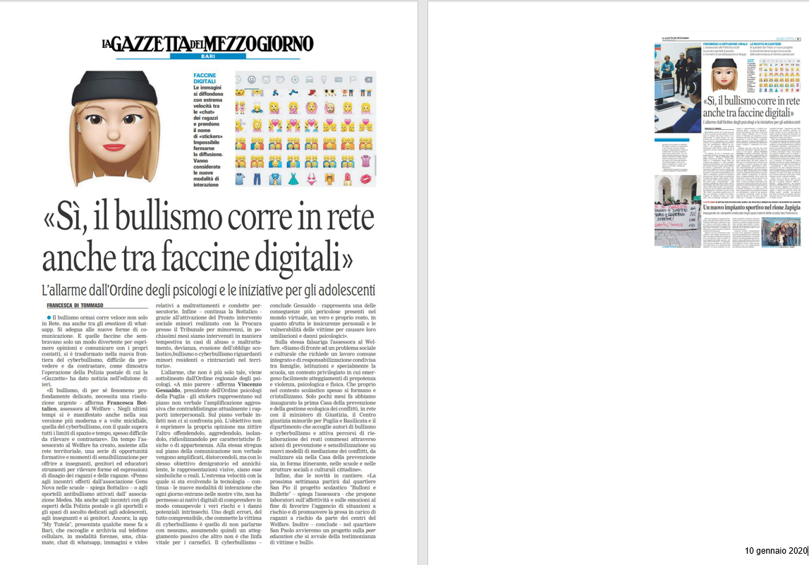 Home > Tutte le News > Rassegna stampa > “Sì’, il bullismoi corre in... “Sì’, il bullismoi corre in rete anche tra faccine digitali” – La Gazzetta del Mezzogiorno Gennaio 10, 2020 L’allarme dall’Ordine degli psicologi e le iniziative per gli adolescenti.